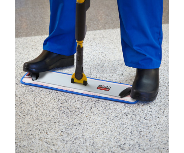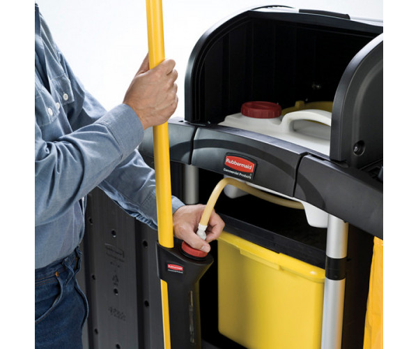 Instrumento de higienização com mop e aplicador de líquidos integrados. Capaz de cobrir amplas áreas, contribui para o aumento da velocidade no processo de limpeza. É composto por um cabo ergonômico, um sistema de fixação de mop projetado para rápida e fácil substituição e um reservatório de líquido para limpeza integrado ao cabo.